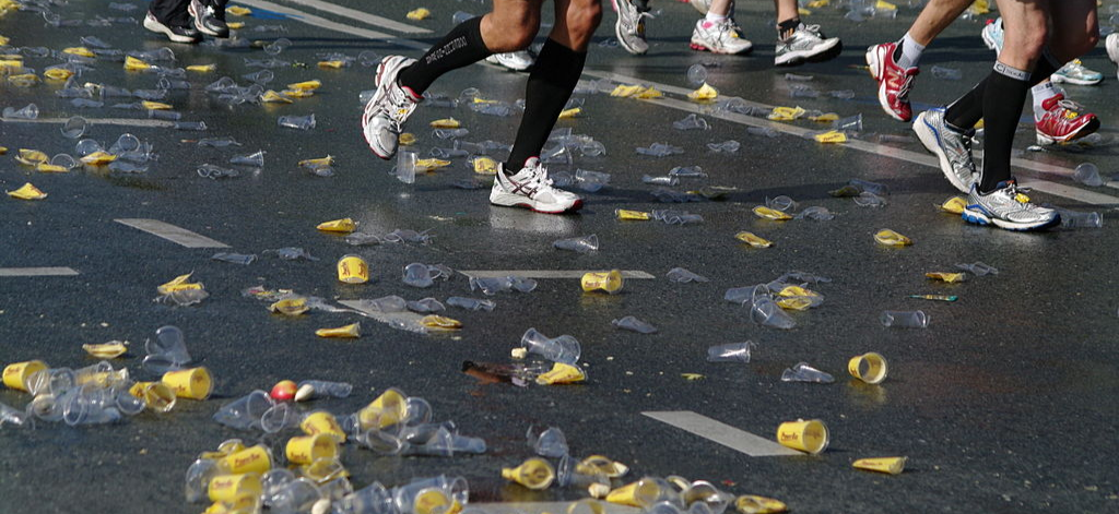 Plastic cups littering the ground during the Berlin Marathon, from Dirk Ingo Franke.