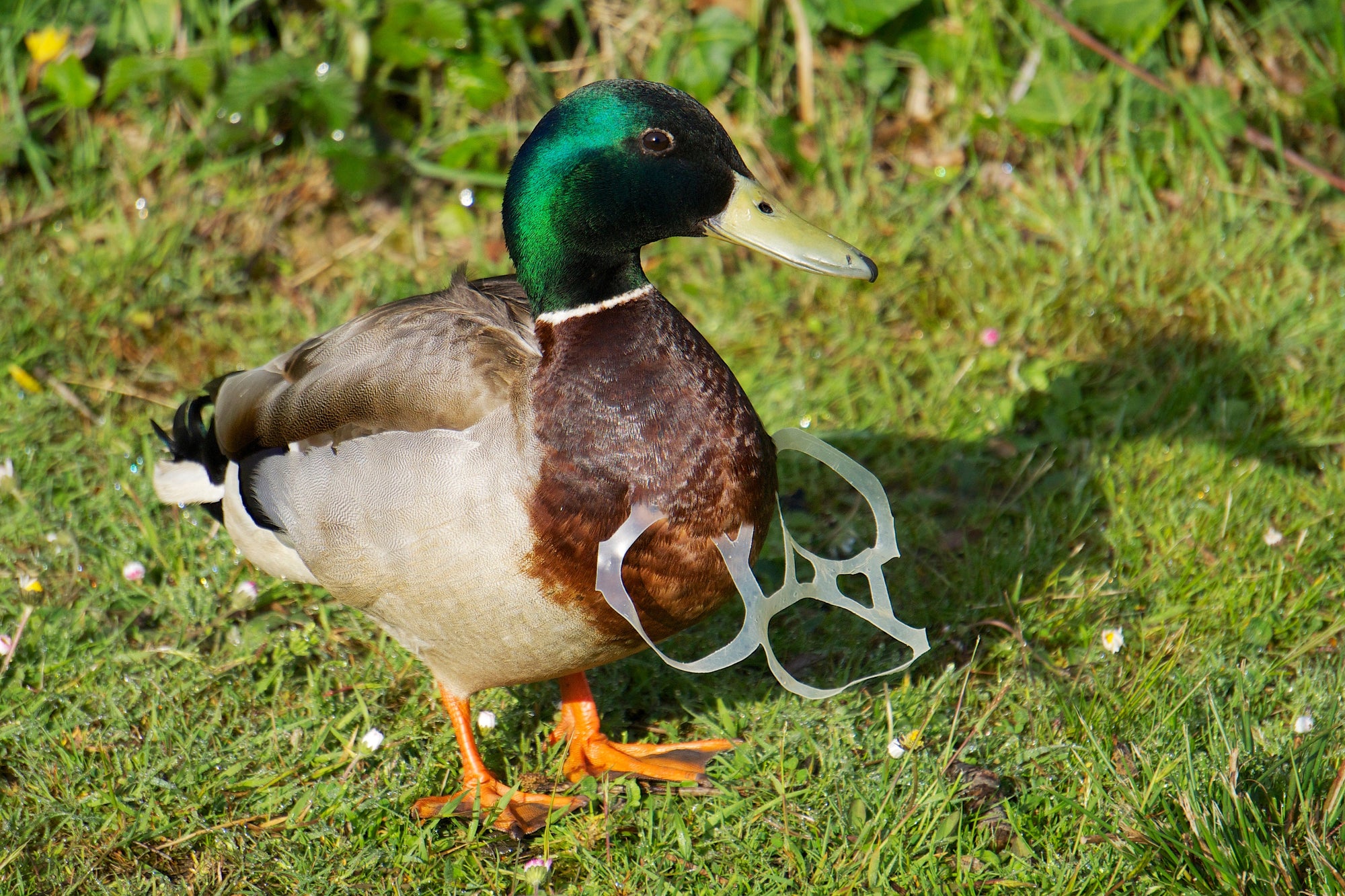 A duck with a plastic 6-pack ring around its neck, from Ian Kirk.