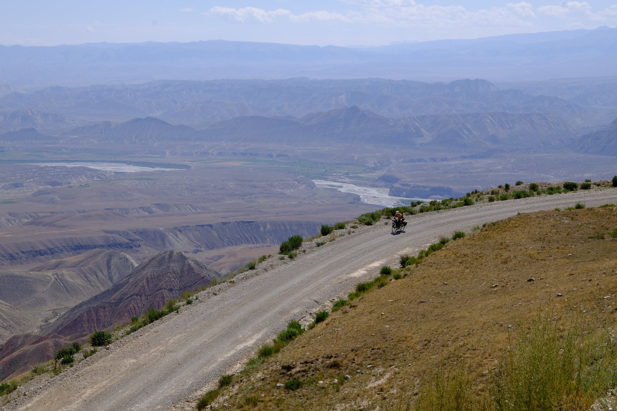 The riding became a different beast as we left the town of Jalal-Abad and the tarmac ended, with chunky gravel tracks leading through the mountains and into the sky. The mountains were simply incredible and by following dirt and gravel tracks, we were able to get away from the traffic and deeper into the remote wilderness that had been eagerly anticipated by us both. Every corner produced yet another postcard worthy view, the sheer scale of which was often tricky to describe and impossible to capture on camera. I began to really suffer as we progressed further into the mountains but put it down to riding a 45kg bike over rough terrain with thin, yet incredibly dusty air at the high altitudes we were riding at.