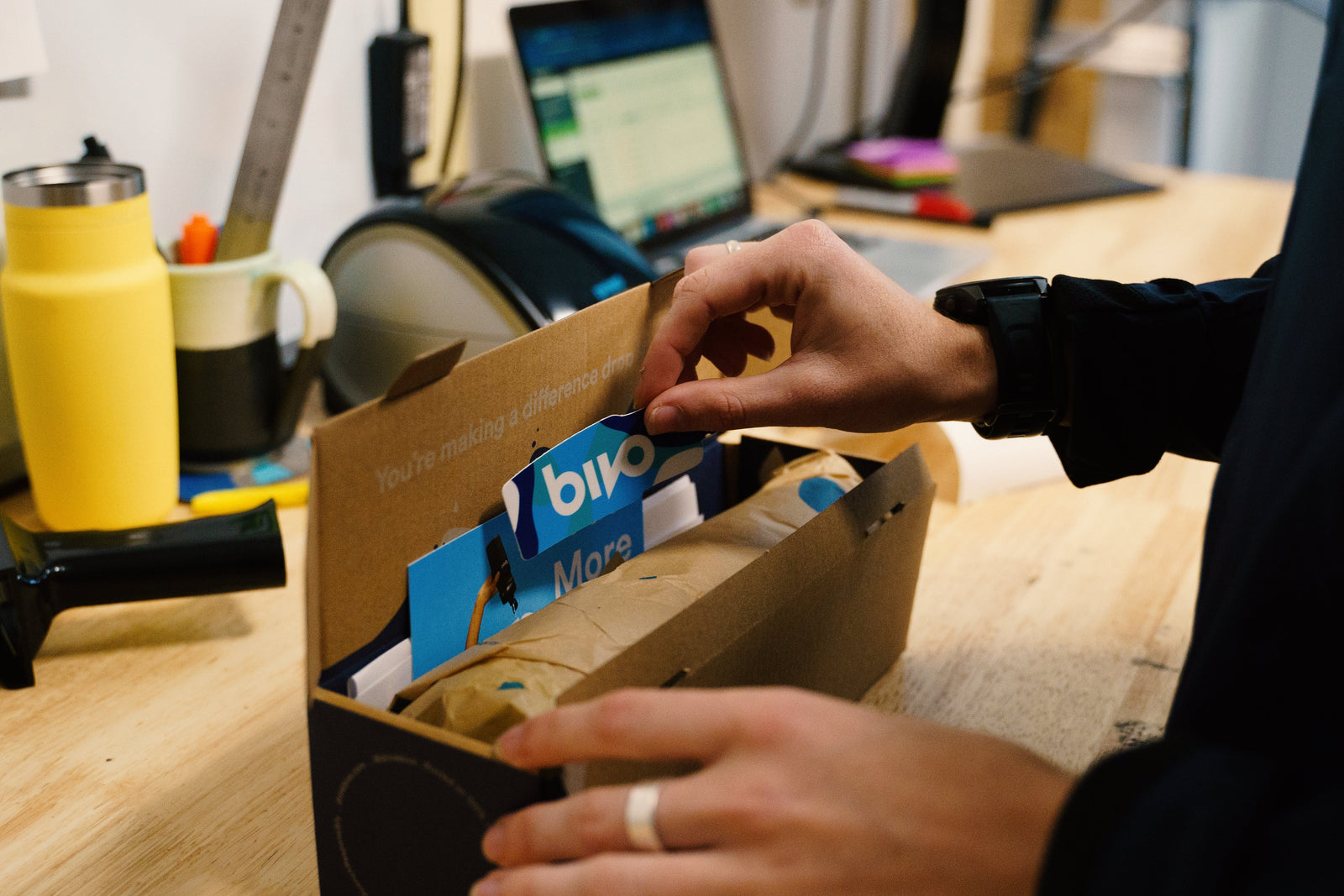 Finally, our shipping box was designed to act as our ‘brand box’ all in one. While we know that stickers and shopping always scuff up a box on your doorstep, we also know our Bivo customer is simply excited about what’s in the box. So we focused there, placing modular structures that hold your Bivo in a safe place, while still having fun with hidden messaging inside the box.