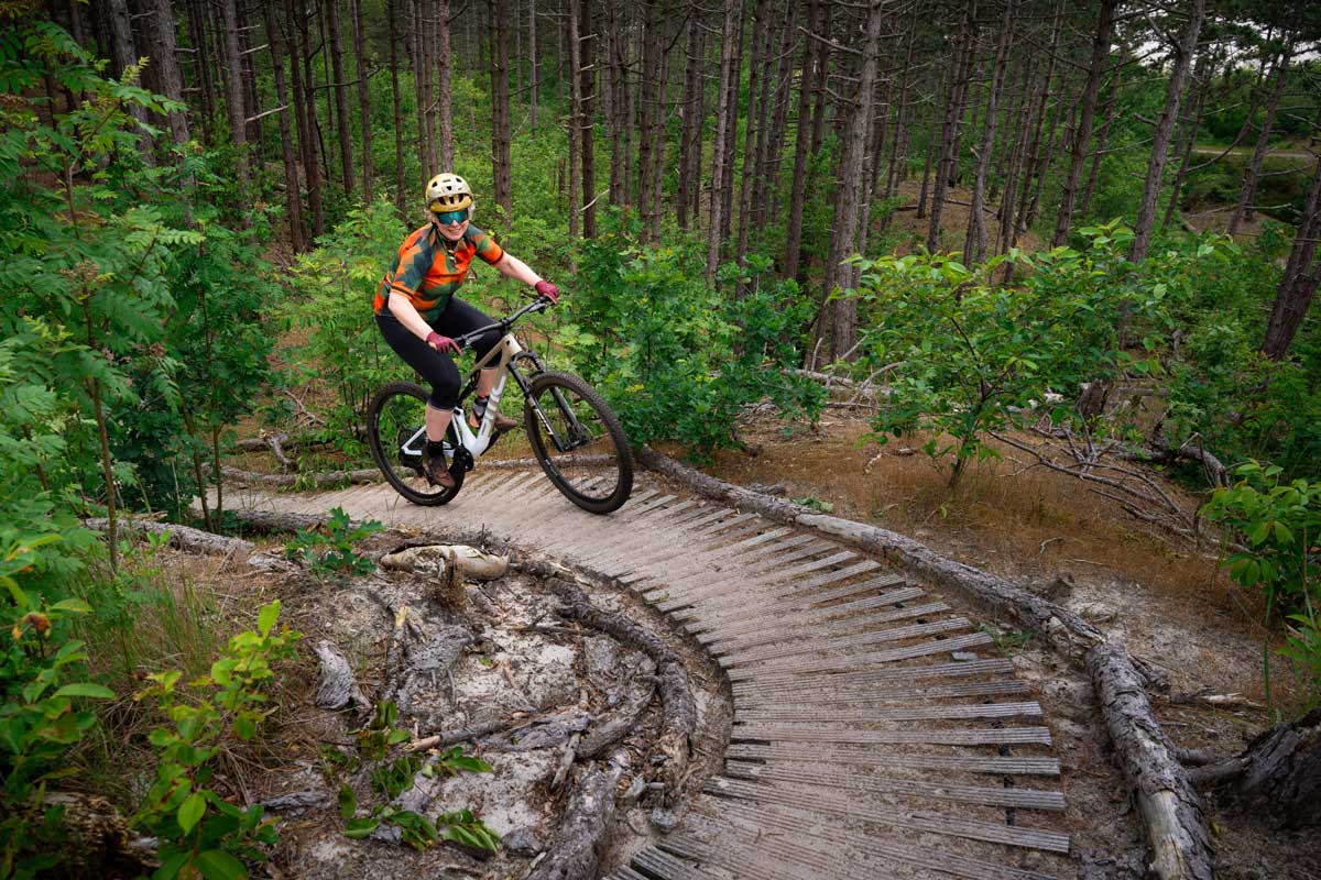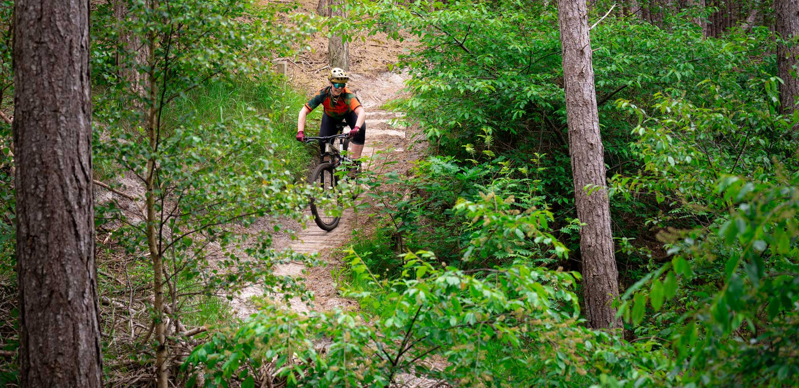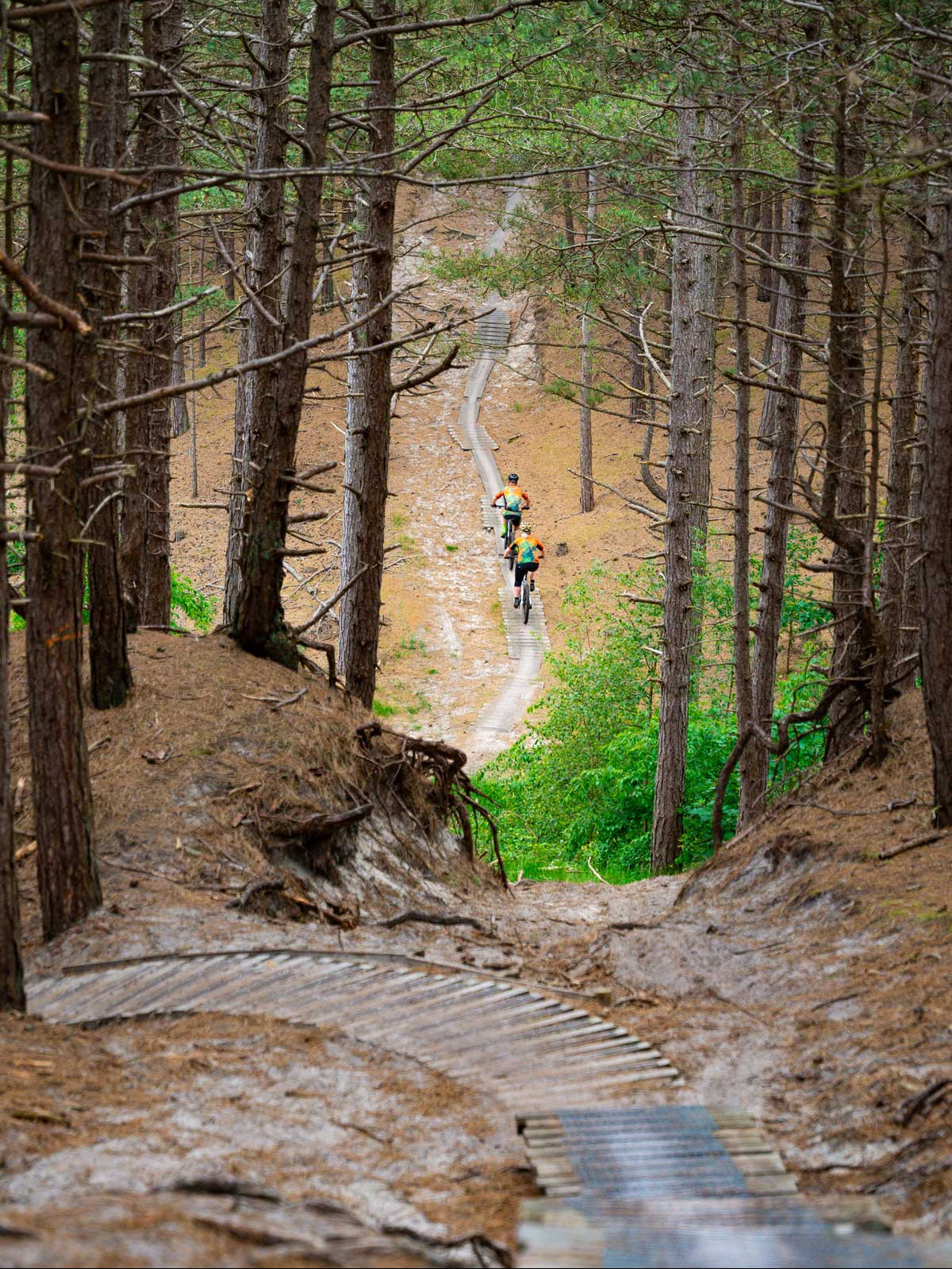 The Schoorl mountain bike trail consists of narrow singletracks winding through forest and dunes. These are combined with short but punchy climbs, fast descents, and surprisingly technical sections. Sand always plays a leading role. Sometimes it is firm and fast, sometimes loose and tricky. Riding in sand quickly teaches you that forcing things does not work. Relaxation is essential. Looking ahead, letting your body move with the bike, and holding the handlebars lightly, like holding a small bird you do not want to squeeze, make all the difference.